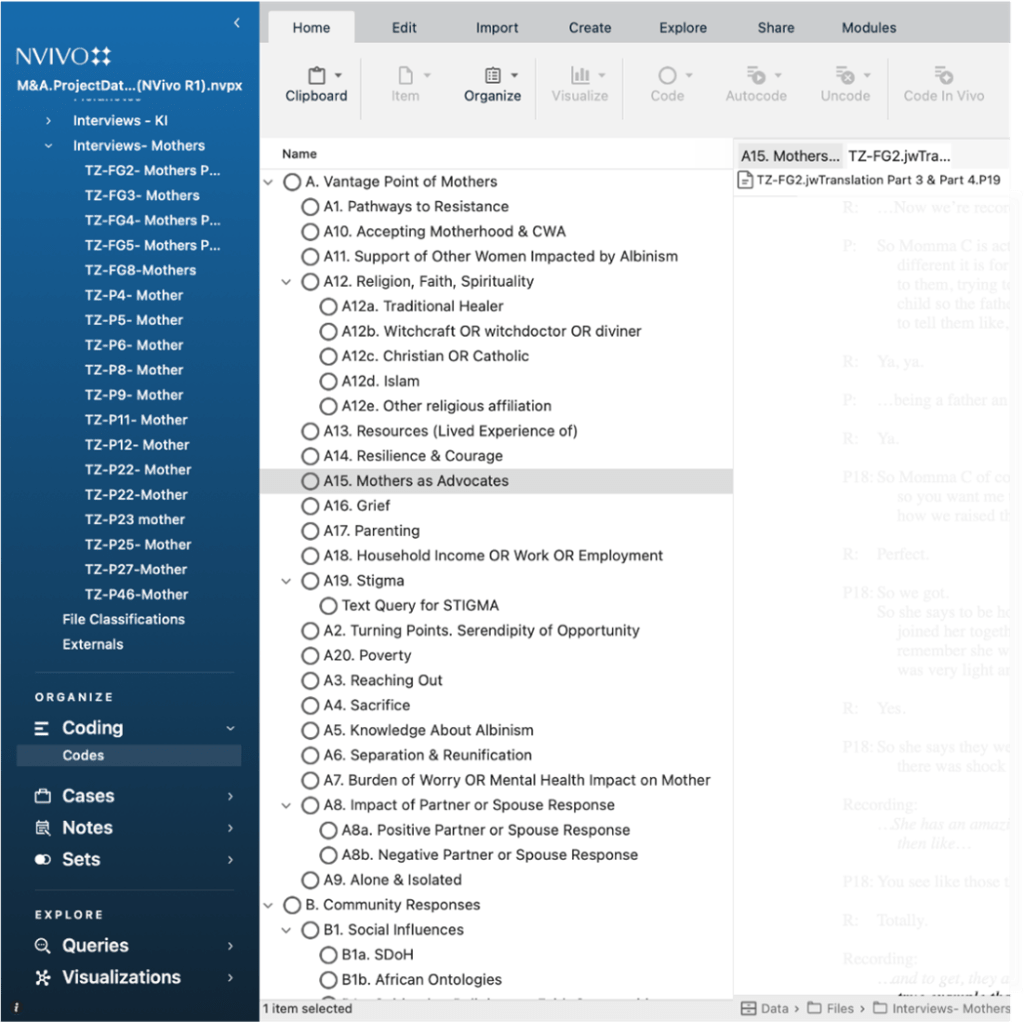 We are using NVivo™ for qualitative ethnographic data analysis, which is the more common application of this software. For this qualitative study on Mothering & Albinism (SSHRC Insight Grant #435-2019-1120), we have also utilized NVivoTM to manage demographic details about participants and their transcribed interviews.
