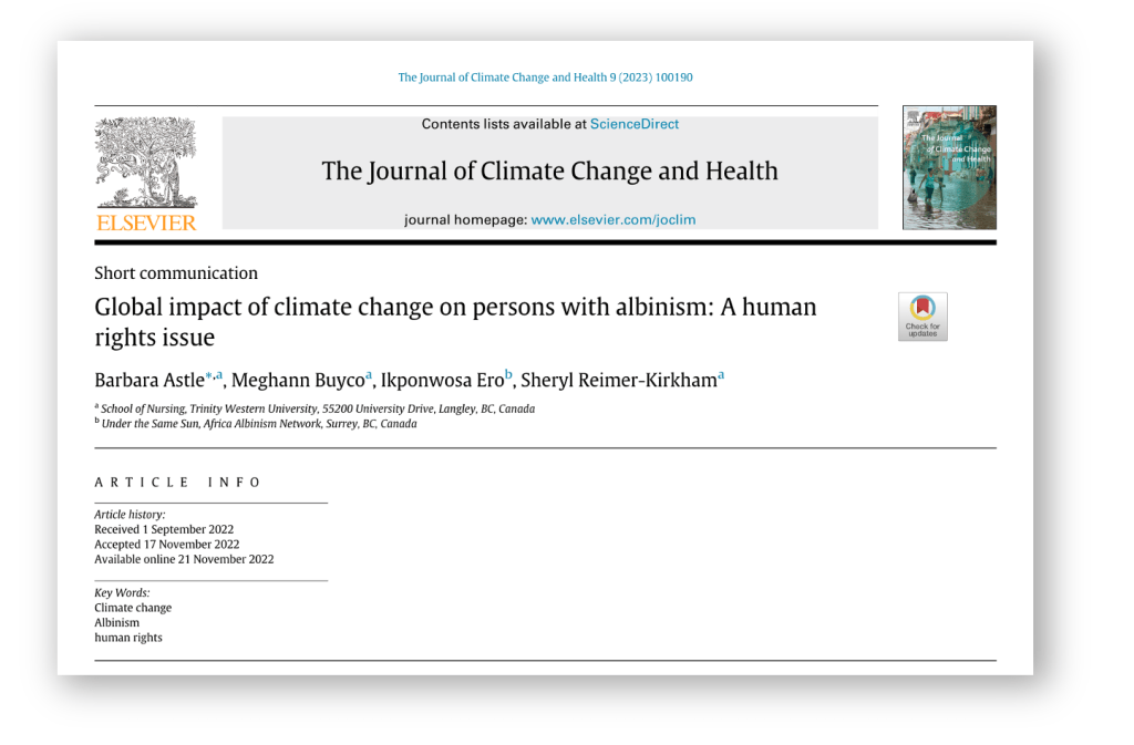 Astle, B., Buyco, M., Ero, I. & Reimer-Kirkham, S. (2022). Global impact of climate change on persons with albinism: A human rights issue. Journal of Climate Change and Health, 9(100190). https://doi.org/10.1016/j.joclim.2022.100190