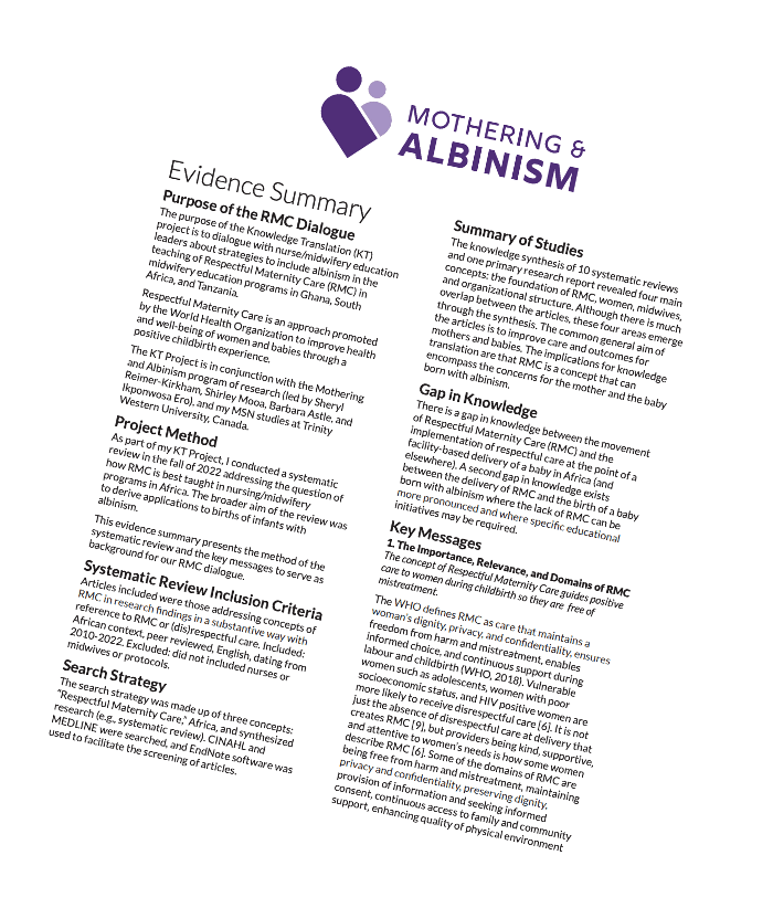 I have learned during my engagement in the Mothering and Albinism research that many mothers do not benefit from RMC when they give birth to a baby with albinism (Reimer-Kirkham et al., 2020; Taylor et al., 2021). The care, attitude, and knowledge of a nurse or midwife, however, can quickly provide a foundation for the adjustment a mother must make and the challenges they may face, especially for mothers who have no knowledge about albinism or relatives with the condition. These birth stories are what prompted me to focus the attention of my KT project on RMC, specifically in relation to albinism.