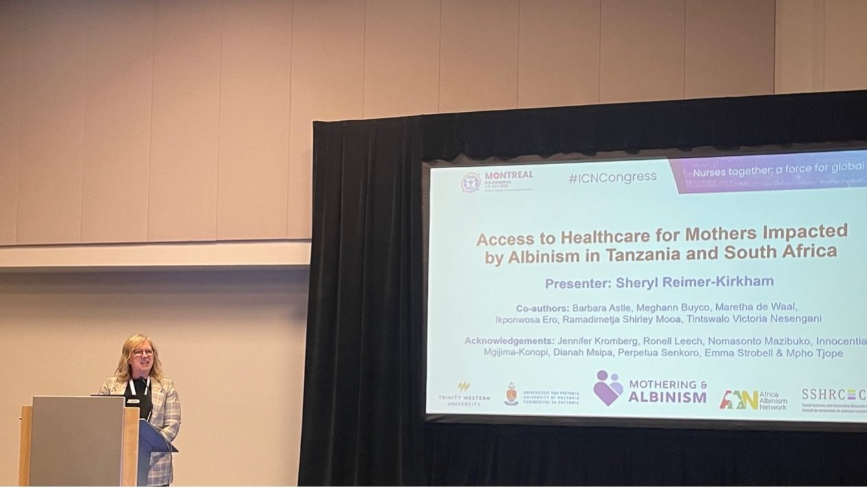 Sheryl Reimer-Kirkham presented on the access to healthcare of mothers impacted by albinism in Tanzania and South Africa, highlighting the varied access to health information and limited access to healthcare services, including sunscreen, skin and vision care, and genetic counselling.
