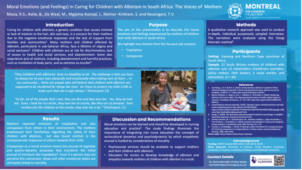 We were honoured to highlight persons with albinism, their mothers, and their siblings in this international nursing gathering and to educate nurses of their experiences in Africa. For nurses, the research has implications for health teaching, advocacy for health access, trauma-informed care, family-centred care, human rights and the SDGs, and global health research methodologies that emphasize partnerships and decolonial approaches.