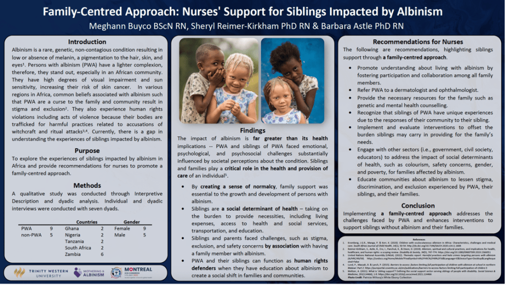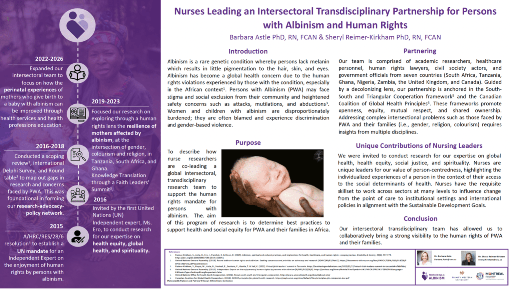 Through an e-poster, Barbara Astle and Sheryl Reimer-Kirkham shared the development of our program of research on Mothering and Albinism, starting with an invitation from Ikponwosa Ero (inaugural UN Independent Expert on the enjoyment of human rights by persons with albinism) to our expanded research on birthing stories. The e-poster described our intersectoral transdisciplinary partnership and the importance of nurses being involved in this international work on mothering, albinism, and human rights.