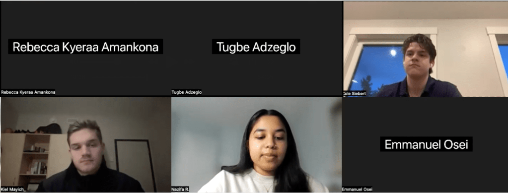 Working with a group that met solely online was both challenging and rewarding. Initially, I felt a sense of distance since we couldn’t interact face-to-face, which made building rapport difficult. However, I quickly realized that the online format allowed for diverse perspectives and flexible scheduling. – Rebecca Kyeraa Amankona