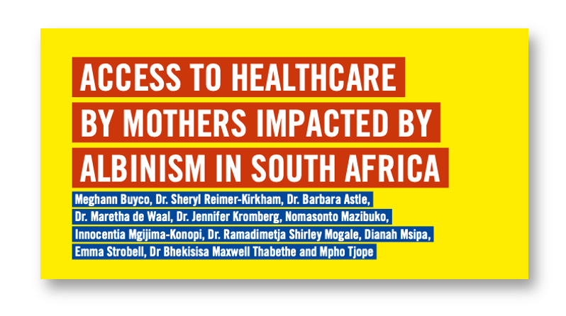 Buyco, M., Reimer-Kirkham, S., Astle, B., de Waal, M., Kromberg, J., Mazibuko, N., Mgijima-Konopi, I, Mogale, S., Msipa, D., Strobell, E., Thabethe, M., Tjope, M. (2025). Access to healthcare by mothers impacted by albinism in South Africa. Southern Africa Journal on Albinism and Socio-Economic Rights. Click here.