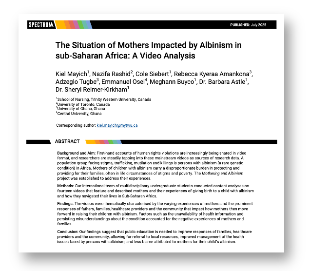 Mayich, K., Rashid, N., Siebert, C., Amankona, R., Tugbe, A., Osei, E., Buyco, M., Astle, B., & Reimer-Kirkham, S. (2025). The situation of mothers impacted by albinism in sub-Saharan Africa: A video analysis. Spectrum, 15. https://doi.org/10.29173/spectrum303